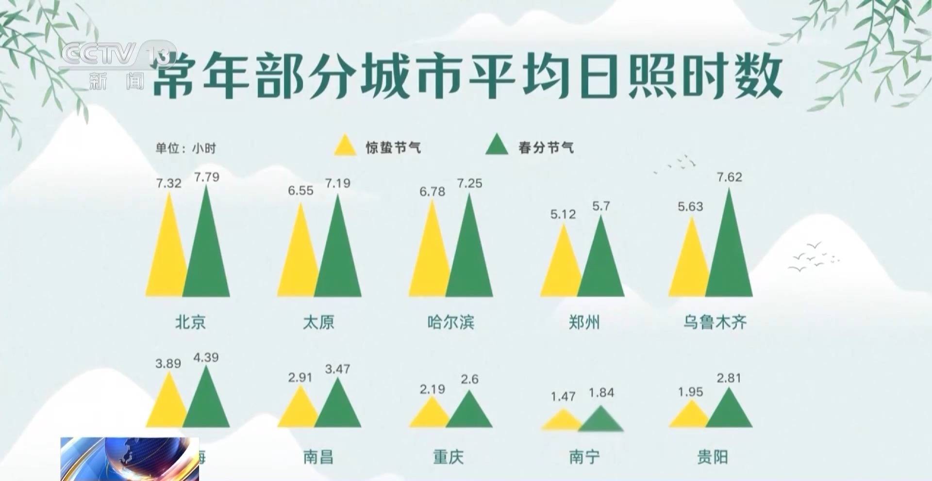 国家气象信息中心数据显示,春分时节,我国各地日照时长相比惊蛰节气普遍增长,大部分地区平均气温超过10℃,石家庄、北京、天津等北方城市常在春分时节迎来气象学意义上的春天。